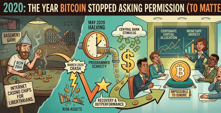 If 2020 proved anything, it was that Bitcoin no longer needed to ask permission to matter. The year began with the asset still carrying the baggage of its previous boom-and-bust cycle and ended with institutions, public companies, and macro investors suddenly treating it as something more serious than internet casino chips for libertarians. That shift did not happen because Bitcoin became less volatile or less weird. It happened because the world itself became unstable in ways that made a scarce, borderless digital asset look a lot more interesting than it had a year earlier.